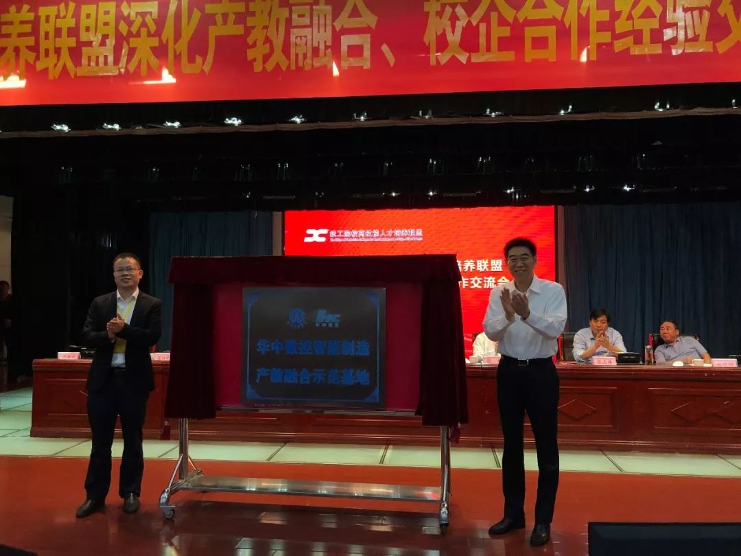 ????? 會上,人力和社會保障部原副部長王曉初,華中數控總裁田茂勝一起為華中數控智能制造產教融合示范基地揭牌。