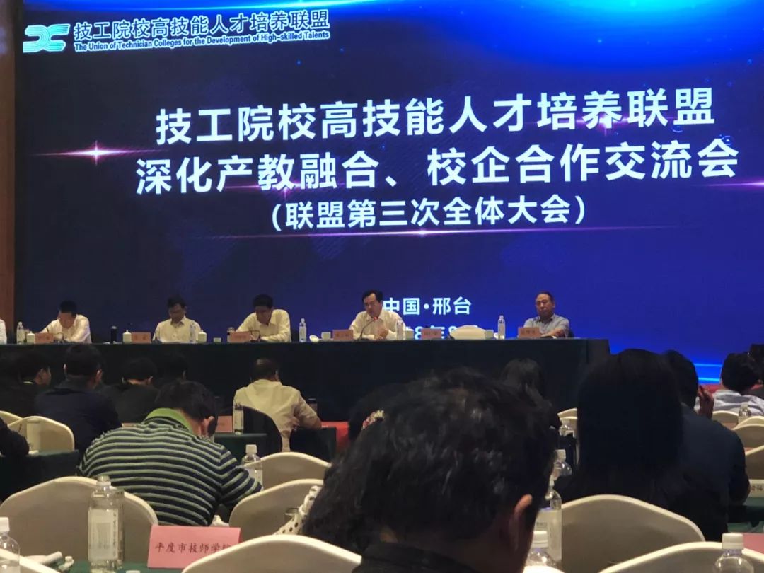 ? ? ? 9月26日,技工院校高技能人才培養聯盟(以下簡稱“聯盟”)深化產教融合校企合作交流會(第三次會議)在邢臺技師學院隆重召開,人力和社會保障部原副部長王曉初、人社部職業能力建設司司長張立新、邢臺技師學院院長荀鳳元、華中數控總裁田茂勝等有關領導出席會議。來自全國200多所聯盟技工院校代表和多家校企聯盟合作企業代表等400余人參加會議 。