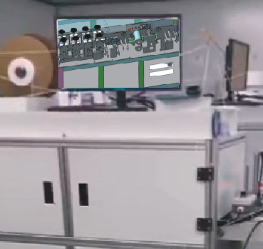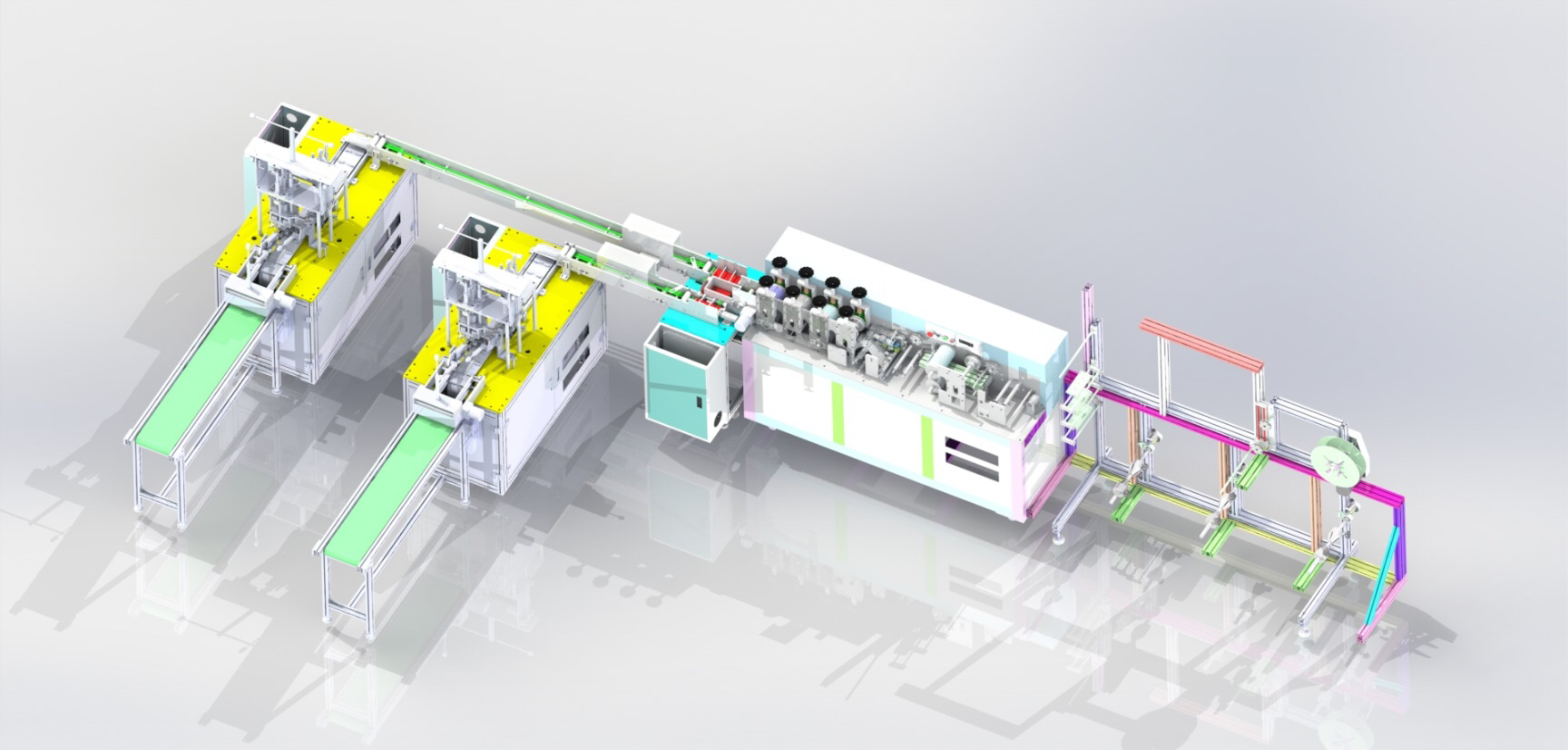 主要由設(shè)備無紡布卷料放置架、口罩疊壓本體機(jī)、鼻梁筋自動(dòng)校直裁剪、自動(dòng)收折、焊接、裁剪、轉(zhuǎn)料輸送帶、耳帶焊接機(jī)、自動(dòng)下料輸送帶等組裝。