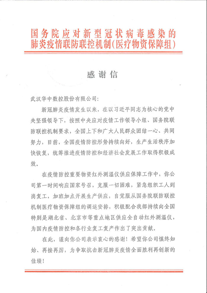 國務院聯防聯控機制醫療物資保障組由工信部主要負責同志任組長,主要負責醫用防護服、醫用護目鏡和眼罩、醫用口罩、消殺用品、負壓救護車、紅外體溫計等重點醫療物資的生產保障,統籌調度急需防疫物資。國務院感謝信中指出:華中數控公司“第一時間響應國家號召,克服一切困難,緊急組織工人到崗復工,加班加點開展生產供應,自覺服從調運安排,……,為國內疫情防控和各行業復工復產作出突出貢獻”。